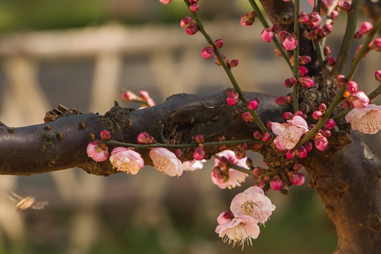 酷似鳄鱼头的枝杆上,朵朵红梅透出阵阵清香,一只蜜蜂闻味闪时飞临。