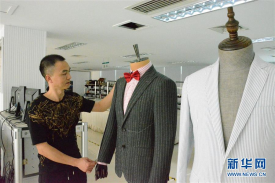 10月17日,在福建省七匹狼实业股份有限公司晋江生产基地技术中心,首席技能指导师胡牛崽检查新的服装版型。新华社记者 黄鹏飞 摄