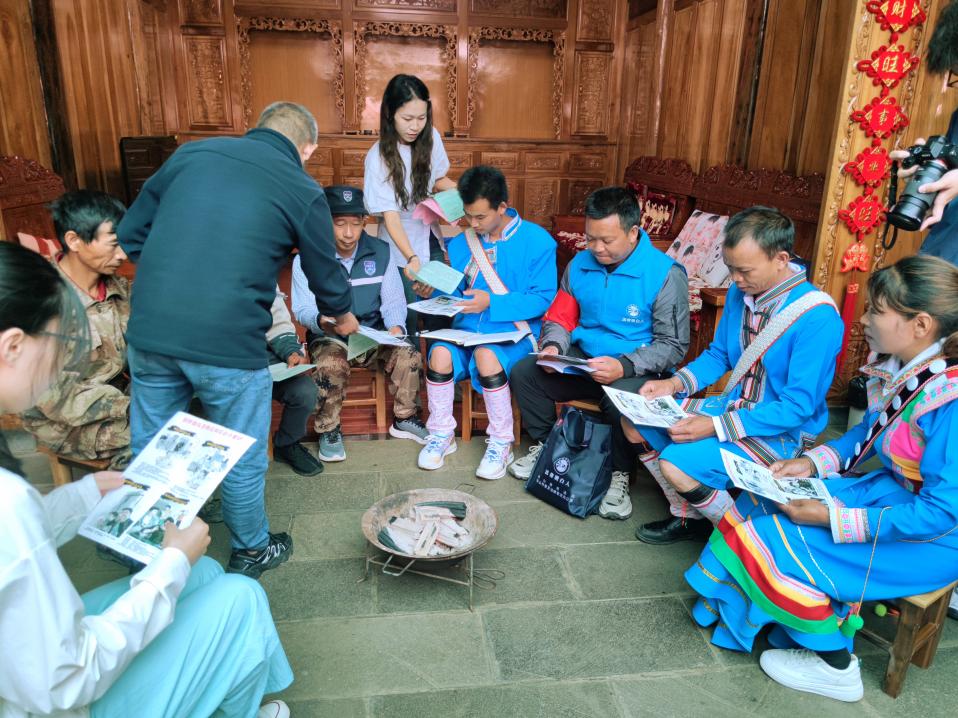 猴桥村村干部在火塘会上发放材料 刘铄桢 摄