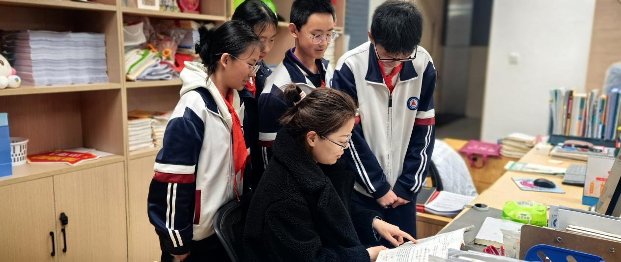 课间,老师在办公室里耐心解答学生的问题,帮助学生解决学习和生活中的困惑。