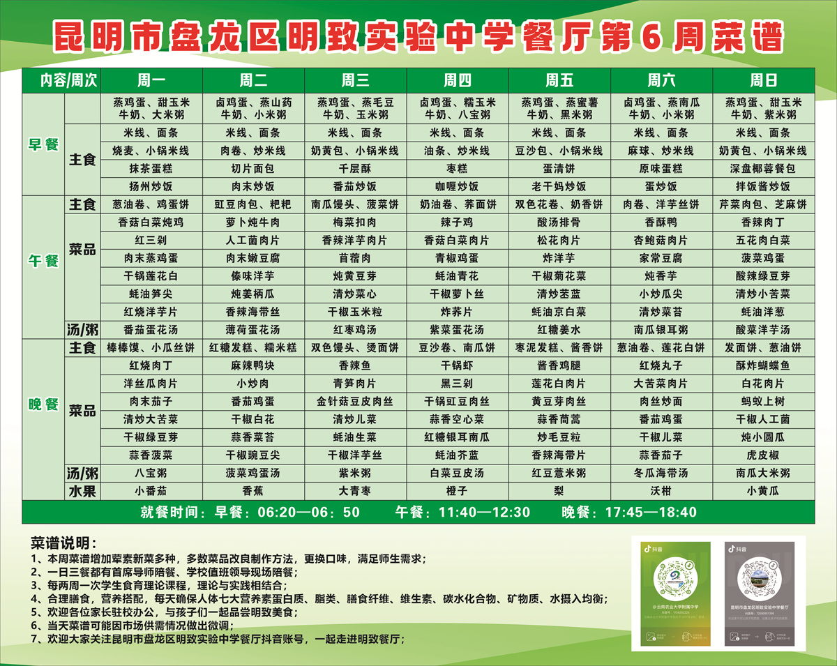学校餐厅自主经营,是以食品安全为底线,以师生成长需求为目标的昆明市A级餐厅,赢得了上级政府和社会各界的好评。学校每天的饭菜都做到了合理膳食、营养搭配,每天确保满足人体所需的七大营养元素。