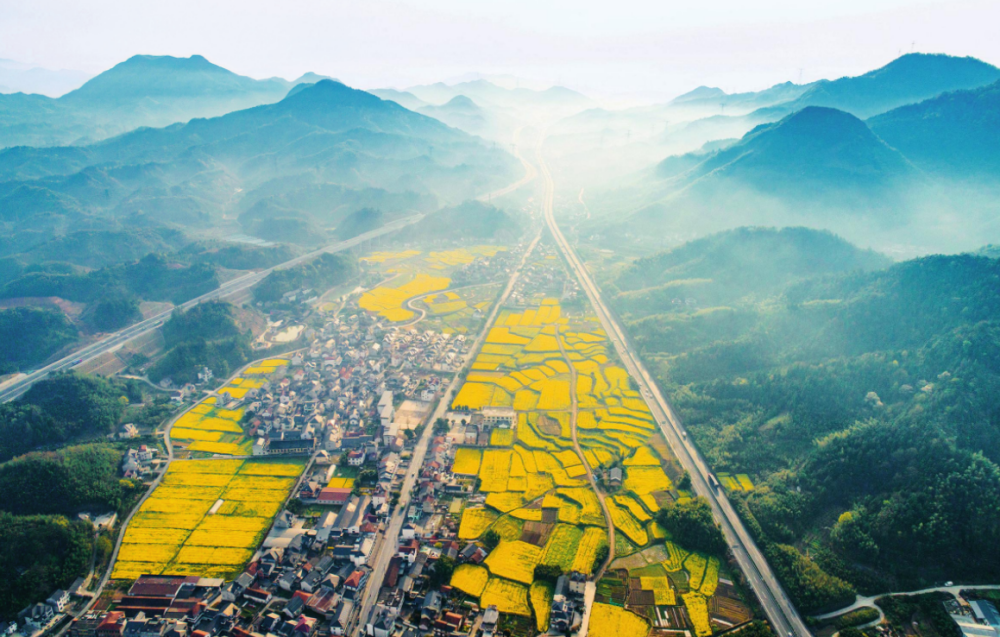 在浙江省杭州市临安区天目山镇横塘村,油菜花田与村庄、公路、群山构成一幅美丽画卷(2025年4月2日摄)胡剑欢摄