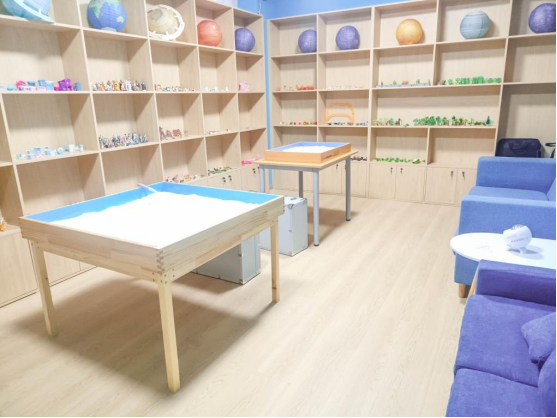 沙盘室中,细腻的沙子与精美的摆件构建出一个个微观世界,映射出学生们的内心世界。