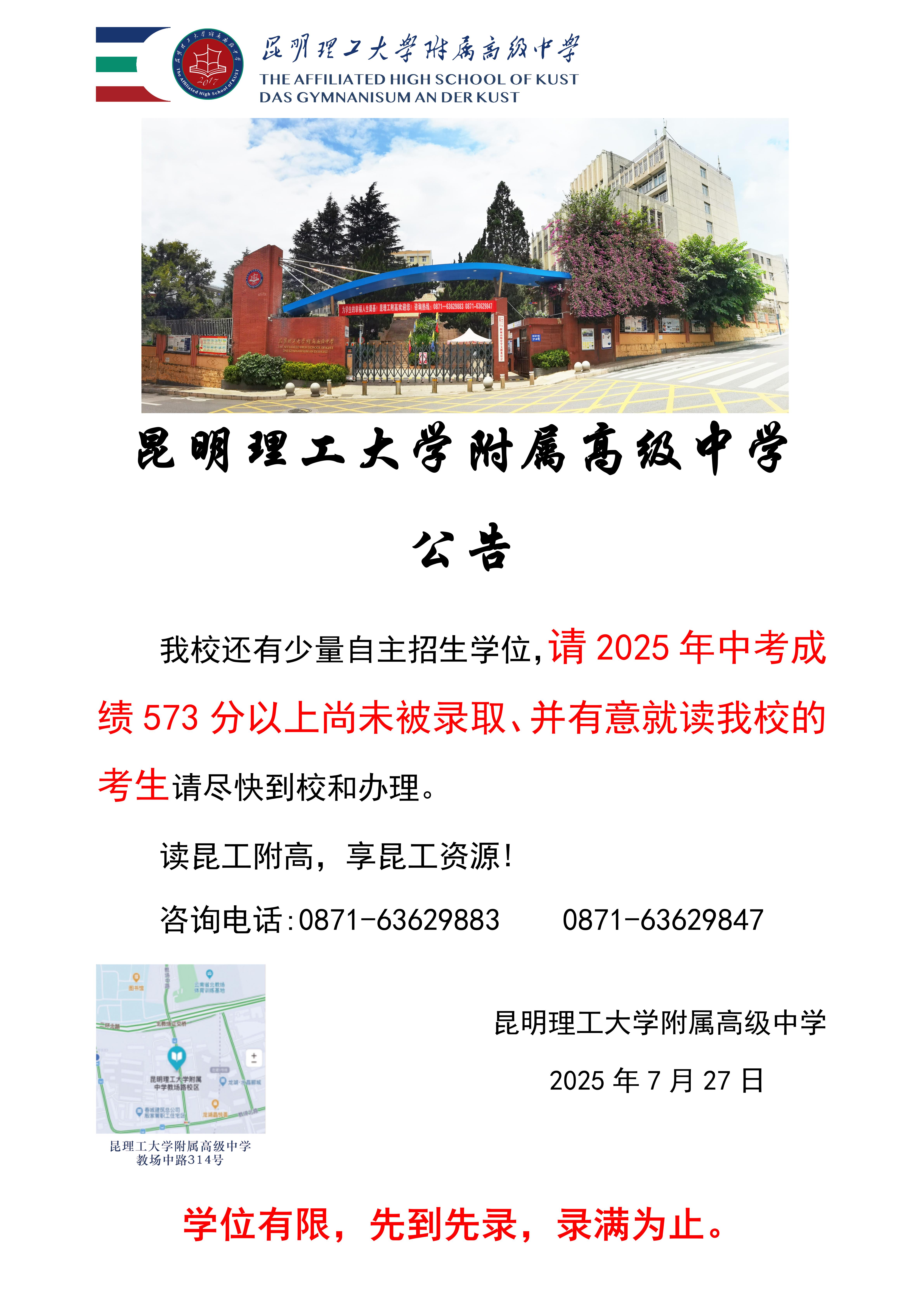自主招生开始,学位有限,先到先得咨询电话:0871-63629847、0871-63629883