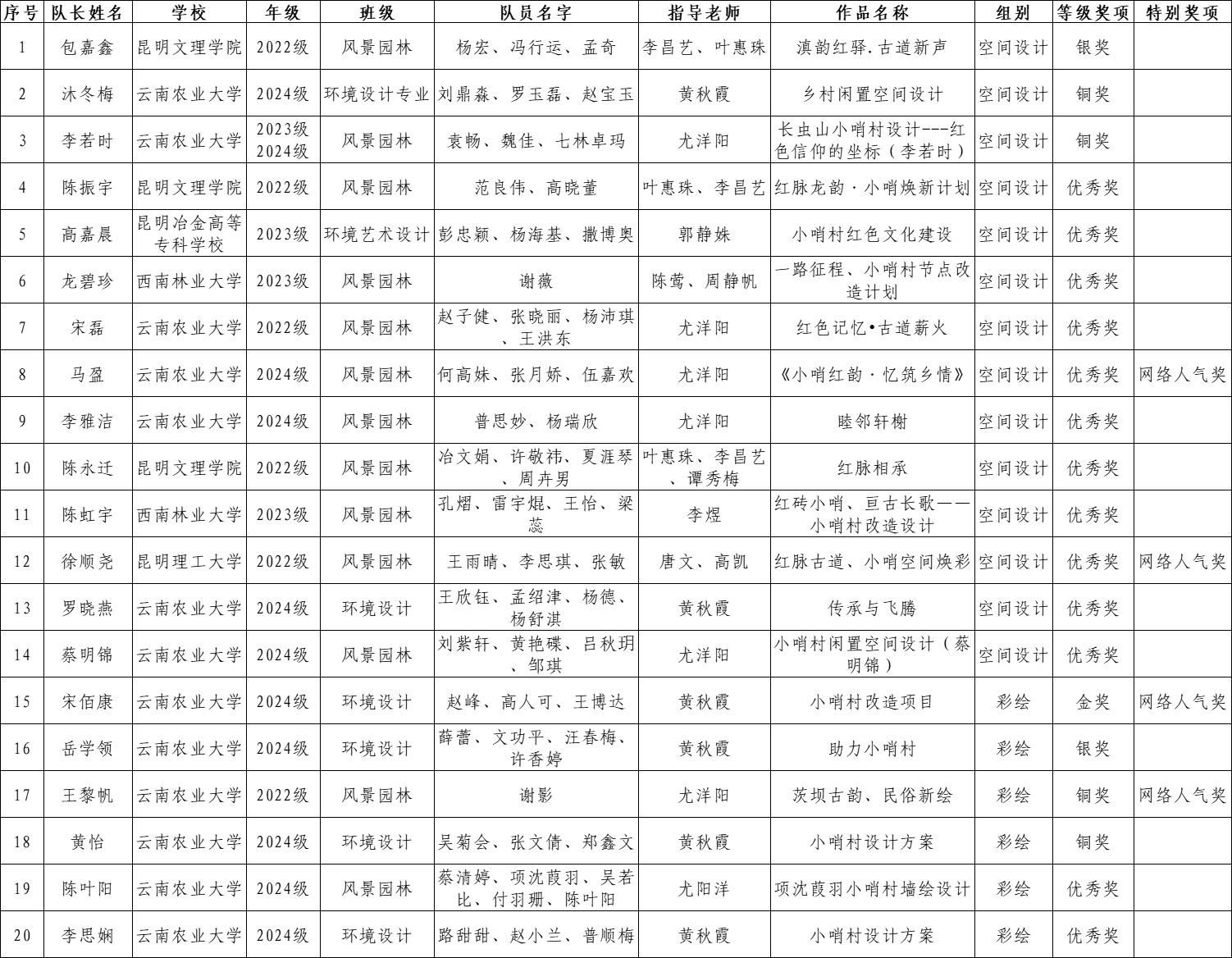 云南农业大学、西南林业大学、昆明冶金高等专科学校、昆明文理学院、昆明理工大学5所高校42支参赛队伍206名学生参赛,42个紧扣乡村实际的设计方案参评。评选优秀奖作品13个,铜奖作品4个,银奖作品2个,云南农业大学《小哨村改造项目》作品摘得金奖桂冠。
