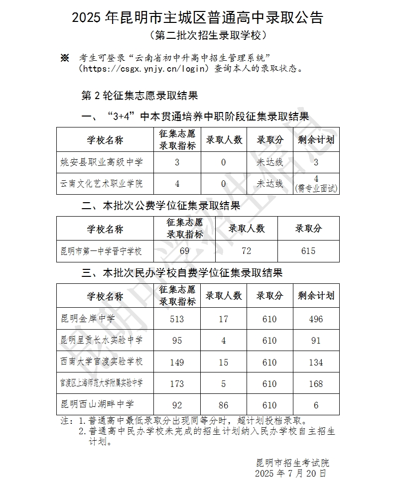昆明市主城区普通高中第二批次招生学校第二轮征集志愿录取结果公布