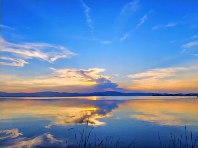 信步至临湖栈道,落日迎来高潮。漫天霞光倾泻而下,在湖面上铺成一条金色甬道。孩童在浅滩追逐嬉闹,脚印烙进微暖的岸滩。湖那边的远山在余晖中翻涌成紫色波涛,等待星空降临后燃起的万家灯火。