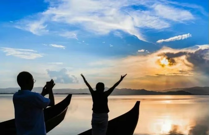 每当夕阳熔金时,滇池湖面就会被染成一片流动的琥珀色。立秋后,晋宁区上蒜镇的牛恋小渔村,迎来了它最动人的光景。