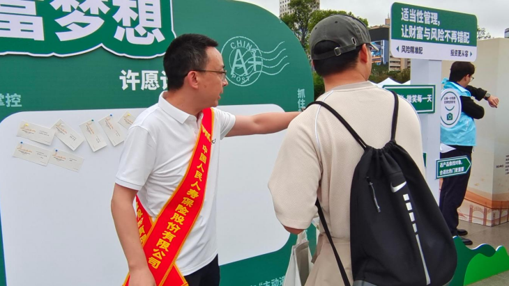 人保寿险云南省分公司相关人员积极投身绿色展区宣传工作,该展区以哈尼梯田为造型,分层展示了人生不同阶段的资产配置建议,突出“适当性管理”核心要求。