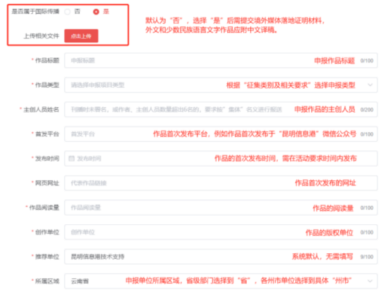 作品标题、申报类型、主创人员姓名、作品首发平台、发布时间、作品网址(音视频和专题专栏需附上二维码)、作品阅读量、创作单位、推荐单位、所属区域。“国际传播作品”在页面选择“是”后需提交落地证明材料,外文和少数民族语言文字作品应附中文译稿,不得改写或超出原文内容。具体填报说明如下: