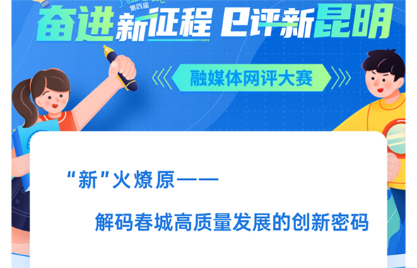 第四届“奋进新征程 e评新昆明”融媒体网评大赛以:“‘新’火燎原——解码春城高质量发展的创新密码”为主题,诚邀您以独特的视角,探寻新质生产力如何为春城高质量发展注入澎湃动能;以深刻的思考,共同勾勒“六个春城”建设的壮美蓝图;以温暖的笔触,讲述“旅居云南·昆明实践”的动人故事;以前瞻的眼光,解读未来城市发展的创新密码。期待您的作品能够:以思想的锐度剖析昆明新质生产力的发展路径;以洞察的深度解读“六个春城”建设的创新实践;以情感的温度呈现“有一种叫云南的生活”的昆明表达;以创意的维度探索城市能级提升的突破方向;以专业的态度为昆明跨越式发展贡献真知灼见。