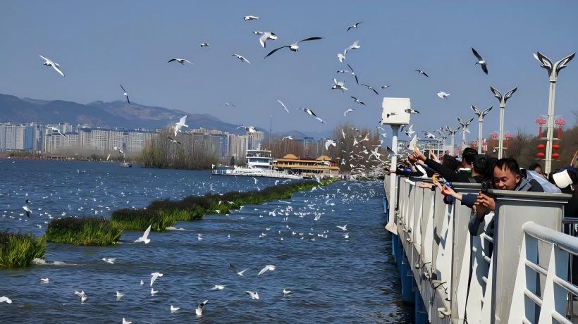 除夕当天,许多游客和市民来到云南省昆明市海埂大坝,观赏越冬的红嘴鸥。