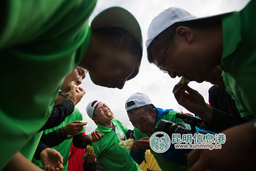 20日一早,参加活动的7家企业代表在万溪冲社区路口集中派发活动道具后前往开幕式活动现场,大家热情洋溢地看着舞台上的表演,并不时用手机拍照留念。随后,7支队伍开始了第一项比赛——疯狂美味。每队分有5kg宝珠梨,在4分钟时间内尽可能吃完它,对最后没有吃完的梨子、剩下的果核及果皮进行称重,总重最少的队伍获胜。比赛现场,每个队员嘴里都塞满了梨肉,有的嘴里边吃着还不停削果皮、将梨切小......脸上都洋溢着笑容,享受着美味多汁的宝珠梨。“这梨太好吃了,又水又甜...”云锰集团一队员嘴里嚼着梨还不忘对记者说。
