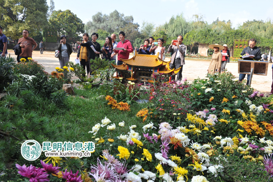 昆明市属7大公园加上园林绿化局下属的苗圃和花木公司带来的“菊韵”、“吉祥如意”、“曲水流觞”、“年年有余”、“游戏童年”等10组菊花造景,分布在大观公园的各个游路结点上,绽放的菊花已达1/3,主要是一些花朵较大的菊花先期开放,小菊大多还在花蕾期。负责造景的园林工人介绍,大部分菊花的盛花期将在国庆节。