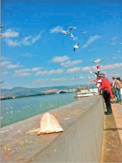 记者昨天在海埂大坝上看到,保洁员李女士推着单车一面弯腰捡袋子和烟头,一面有游客随手将鸥粮袋和烟头丢在地上,还没等她折回,才捡干净的地方又脏了。