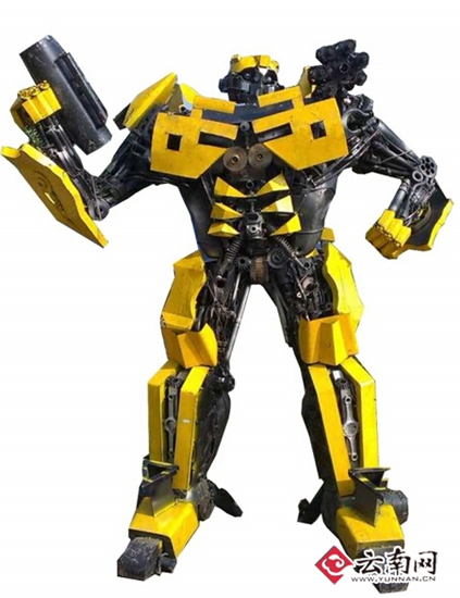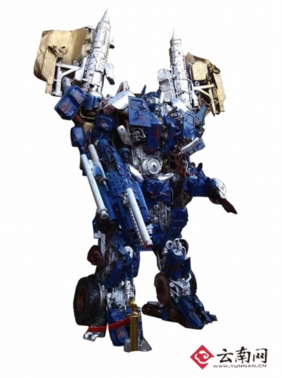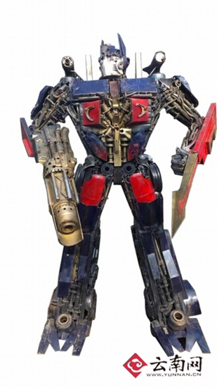 会动、会喷烟、会说话、会唱歌……用废铜烂铁制作的变形金刚,让已经进了报废场的废品有了重生的机会。肩膀上是摩托车的排气管,关节是大小不一的轮毂,头部有轴承和挡泥板,身上还有油管、弹簧、铁板等,用废旧汽车、摩托车零部件拼装、焊接的身体,经过一番“梳妆打扮”,竟然还能说话、唱歌,不仅让人感叹:“废铜烂铁,居然也能制成这么精致、高大的变形金刚。”