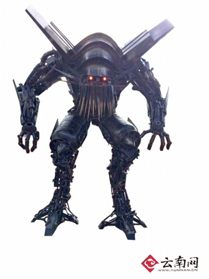 废旧的钢板、轴承等拼制出头部和胸廓,钢管、齿轮等变身为手臂和武器,发动机齿轮拧成盆骨,钢板、链条、扳手等焊接成双腿……这就是记者在现场看到的“擎天柱”。主办方责任人向记者介绍:“这些机器人都是用汽车废弃零件制造,属于钢雕艺术,就是以资源再生利用、艺术创造价值体现绿色环保理念。经过设计师为废旧钢铁注入艺术生命变身为栩栩如生的钢雕,使它的观赏价值和艺术价值能更大的提升。”