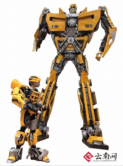 电影里见过的“变形金刚”,一个不少悉数齐聚昆明。这些变形金刚大小不一,有的高达8米,有的只有1米高。姿势各不相同,栩栩如生,身上的轮胎、齿轮、钢管等汽车零件,造型雕塑焊接工艺十分复杂,而且还进行了上色和后期光电效果的处理。擎天柱“看见”小朋友,身上就会闪起光,转动脑袋、眼睛冒着蓝光说:“你好,我是擎天柱……”自我介绍后,擎天柱还会唱歌。其他变形金刚们也会简单的问候语,可以和观众进行简单交流。