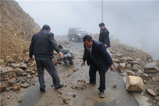 高德荣(右前)在下乡路上清理塌方的落石。王靖生 摄