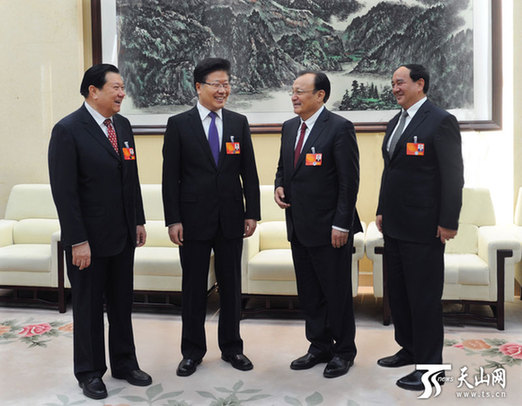 张春贤、雪克来提·扎克尔、乃依木·亚森、努尔兰·阿不都满金在一起交谈。新疆日报记者卢民一/摄