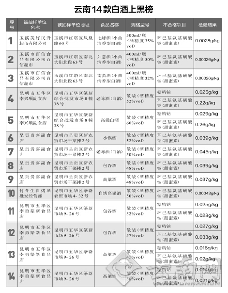 云南14款不合格产品中,有云南云子酒业的七缘酒(小曲清香型白酒),云南易门大龙口酒业有限公司的如意酒(小曲清香型白酒)、南蛮酒(小曲清香型白酒),以及篆新、呈贡农贸市场的部分散装酒,涉及不合格项目为甜蜜素和糖精钠。目前,不合格的白酒企业已被责令立即停止销售、封存问题产品,对经营单位未履行进货查验、经营条件或经营环境不符合食品经营标准和要求的,立即责令整改,整改不到位或拒不整改的,将依法吊销食品流通许可证。