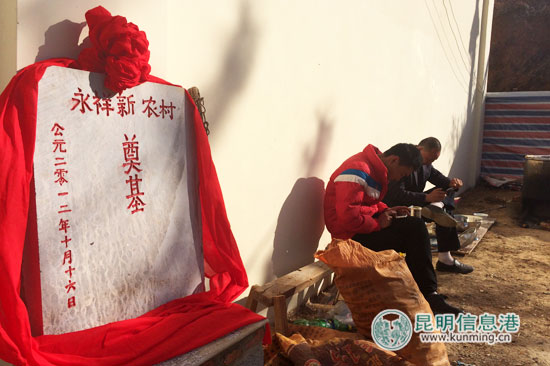 新房奠基之日,村民在万古莫村小组的入口处放置着一块小石碑。记者上官艳君/摄