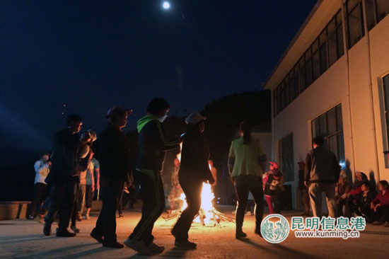 吃完晚饭后,村民们在公房门口燃起火堆,聚在一起跳起了篝火舞,欢快的音乐在空旷的山间回荡。跳得有些累了,一些村民便坐在石坎上休息。村小组组长李正学看着自己的媳妇和乡邻们跳着舞,指了指对面的村子,笑呵呵地说:“以前这个点,我们也和他们一样,呆在自个儿家里,收拾收拾就睡了。”李正学回头看了看坐落在山腰上的新房子,不好意思地挠了挠头。