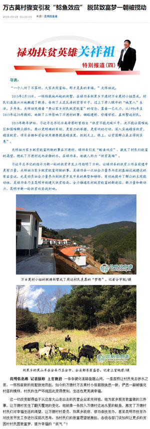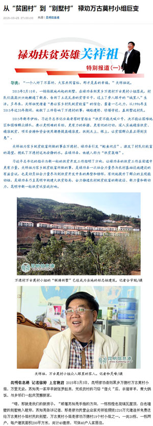 《禄劝扶贫英雄关祥祖》特别报道,是昆明信息港记者历时20余天采写而成。该组报道分为四个篇章:《从“贫困村”到“别墅村” 禄劝万古莫村小组巨变》、《为家乡脱贫致富 关祥祖20年做了三件事》、《关祥祖:历经坎坷有所成 一心想为穷人做点事》、《万古莫村骤变引发“鲶鱼效应” 脱贫致富梦一朝被搅动》。详尽地讲述了大山之子关祥祖20多年来为家乡脱贫致富所做的事情,让万古莫村小组发生巨变,以及在当地激发了村民们的脱贫致富梦,引发“鲶鱼效应”。此外,还独家对话关祥祖,为大家讲述他这些年创业几度被骗,做善事不被理解的辛酸和无奈。