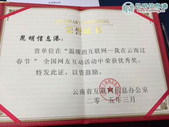 昆明信息港在“温暖的互联网—我在云南过春节”活动中荣获优秀奖。