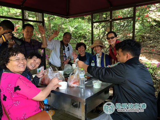 昆明信息港讯 记者刘佳妮 4月3日,在小长假清明节前夕,近30名彩龙网友兴致勃勃地齐聚昆明黑龙潭公园,参加由昆明信息港组织的“龙潭春深·醉美杜鹃”踏青赏花、垂钓、吃烧烤活动。在250余亩杜鹃谷中,杜鹃花仍在艳丽绽放,美景令人陶醉。围着色彩斑斓的杜鹃花丛,网友们纷纷拿起鱼竿,比赛垂钓;随后来到鲜花包围的“龙潭烧烤”亭内“甩”烧烤,踏青气氛轻松、闲适。