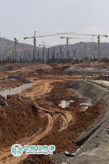 呈贡支线市政府站位于市行政中心5号楼与7号楼之间,开挖位置就在昆三中旁边。昆明市交警支队批复给施工单位的围挡时间是:2014年10月10日到2015年12月31日,为了加快施工进度,白天朝云街春融东路到惠通路段、景明北路到祥和街路段禁止机动车通行,非机动车和行人可通过北侧人行道通行。夜间对交通影响较大的过街管线进行分段施工。昨天在现场看到,整个路段189米长、19.7米宽、18.1米深的基坑已经成型,正在挖掘坑内黑细的粘土。