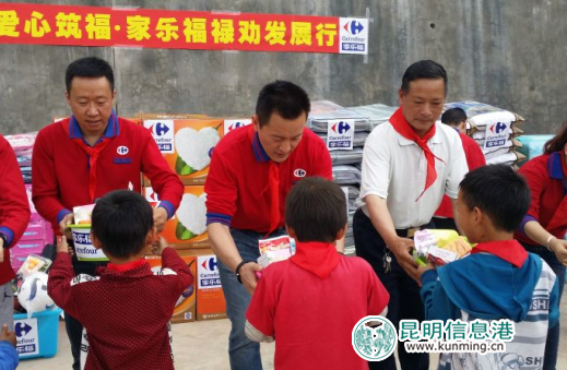 昆明信息港讯 记者邹美连 在昆明信息港多方沟通,牵线搭桥之下,4月21日,家乐福昆明区志愿者一行15人,来到禄劝县皎平渡镇发展村小学,为这里的孩子们送来一批价值6万余元的学习和生活用品。家乐福方面表示,还将继续推进公益活动并发动社会力量,把这份爱心传递下去。