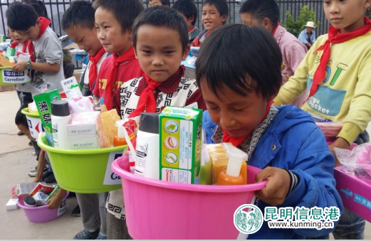 21日一早,家乐福15名志愿者员工一行人从昆明出发,一路颠簸近5个小时,来到禄劝县皎平渡镇发展村国开希望小学,给这里的孩子和老师们带来了学习用品和生活用品,家乐福为全校45名学生每人都备了一套新的书包、字典、铅笔等文具包,全新的毛巾、牙刷、牙膏、脸盆、香皂等个人洗漱用品全部分好,整齐地码放在盆子里,现场分发到每个学生手里。