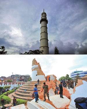 地震前后对比:加德满都拥有百余年历史的达拉哈拉塔
