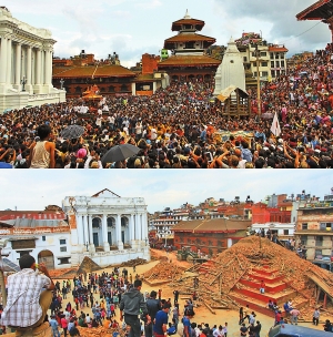 地震前后对比:加德满都世界文化遗产杜巴广场上的建筑 新华社发