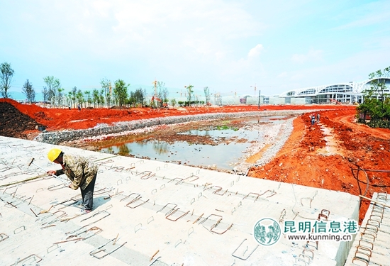 4月28日,昆明最宽景观河道——40米宽的新虾坝河建设工程已完成工程总量的约7成,可保证在5月下旬日如期完工 。图为虾坝河施工现场。记者赵伟/摄