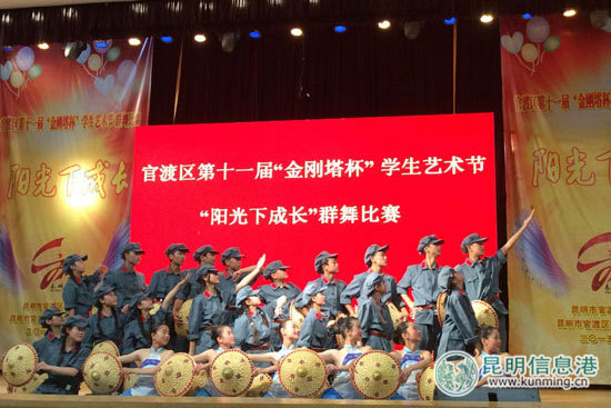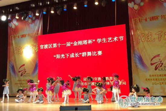 昆明信息港讯 5月16日,“中国梦·春舞大地”2015年春城文化节“夏日童话”少儿艺术节系列活动的第二场海选——官渡区第十一届“金刚塔杯”学生艺术节“阳光下成长”群舞比赛在北大附中举行。此次比赛由昆明市官渡区教育局、昆明官渡区文化体育旅游局主办,来自全区的32所幼儿园及中小学代表队、近千名学生参加了比赛。