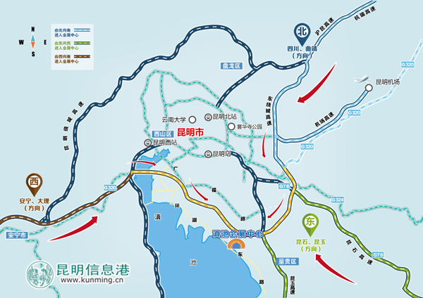 3、昆曲高速--东绕城高速—广福路--珥季路(或昌宏路、飞虎大道)--昆明滇池国际会展中心