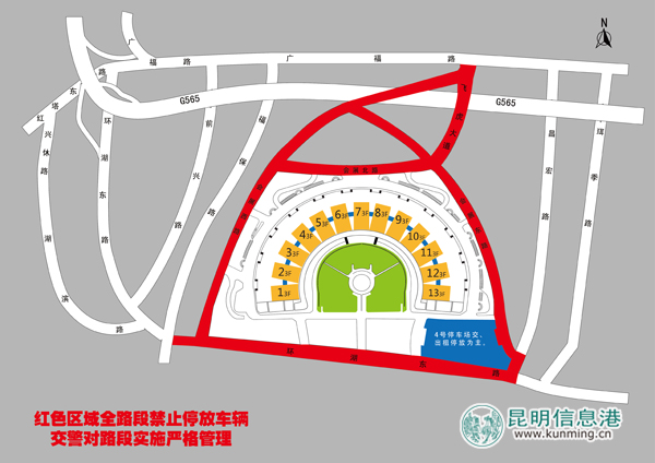 同时,昆明交警特别提示:南博会期间,滇池国际会展中心周边的飞虎大道、会展西路、会展北路、会展东路及环湖东路为全路段禁停路段,届时,交警会对路段实施严格的管理。