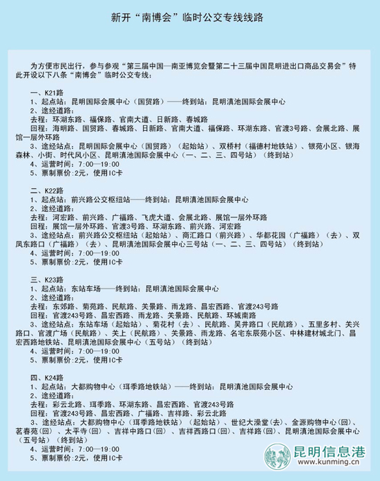 针对展会时段将出现较为集中的交通流,给自驾观展带来一定影响,“南博”展会期间新增开了八条直达昆明滇池国际会展中心的临时公交专线,分别是K21、K22、K23、K24、K25、K26、919F、K27路公交车。同时,昆明交警提醒市民在出行前调整好出行的时间、路线及方式,尽量选择公交出行。