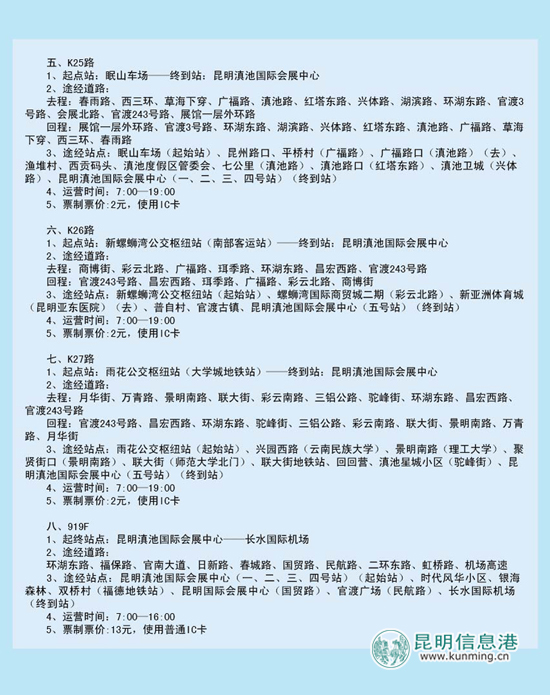 2、环城北路—白塔路--拓东路--春城路--日新路官南大道--福保路--环湖东路--昆明滇池国际会展中心;