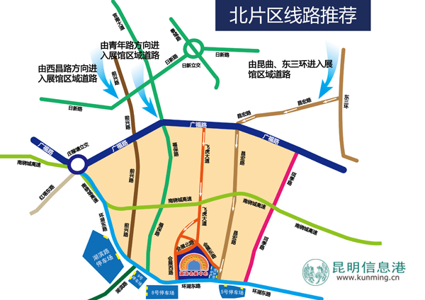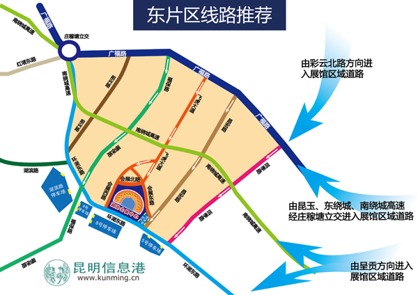 4、昆石、昆玉高速及东绕城、南绕城高速经庄稼塘立交---广福路—前兴路(或选择福保路、飞虎大道、昌宏路、珥季路)----环湖东路--昆明滇池国际会展中心;