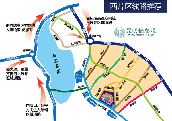 3、杭瑞高速、高海高速---绕城高速(或广福路)--环湖东路--昆明滇池国际会展中心;
