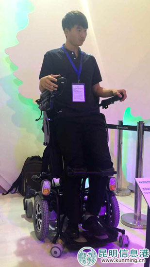 在台湾精品馆中,最受市民热捧的当数可以让残疾人直立行走的轮椅。这款名为康扬元气站的轮椅,设计了独创的安全开关,身体残障者可以借助轮椅的手动控制实现站立,改善下肢残障者久坐不适、易生褥疮的健康问题。坐立下,轮椅最高时速为19km/h,站立下,最好时速为9km/h,完全根据人走路的速度而设计。而超轻量的航空铝合金材质,让轮椅只有57.2斤,载重240斤。