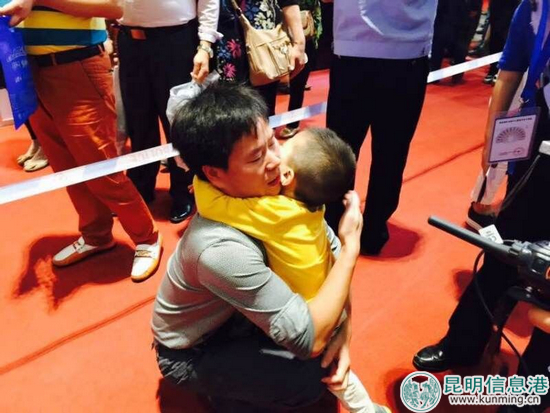 太和所民警立刻用对讲机向周边执勤的民警进行通报,几分钟后,在6号馆执勤的官渡分局吴井派出所民警发现一个哭泣的小男孩,立刻通知焦急的父亲前来认领,在拥挤的场馆内,官渡警方两个派出所接力,帮助父亲找到了走失的儿子。