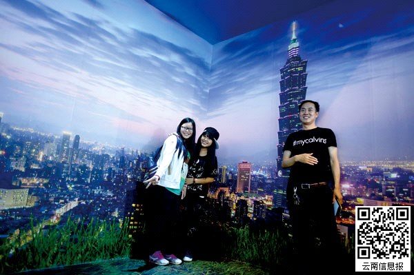 南博会上,市民们在台湾馆101大厦宣传画前合影留念。