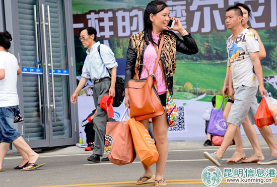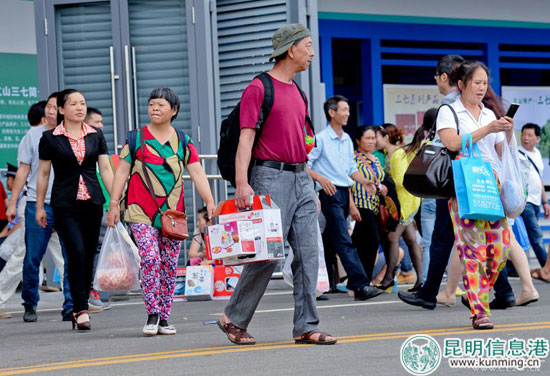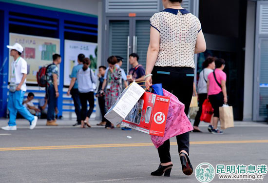 南博会场里有很多年纪较大的阿姨,三三两两一组,手提购物袋,有人甚至还拉着旅行箱,个个准备满载而归。市民苏女士和郭女士说,她们已经逛了一个多小时,但是并不感觉累,还想去买点银饰品。她们用100元买了两条银饰手链,“这里的东西便宜也好看,很开心。”。另一位市民也表示买了好多东西,“买了台湾土特产,泰国的,还有韩国的,大概花了1500块,我每年都到南博会转。”会场里人山人海,昆明市民的热情似火。