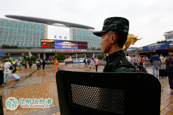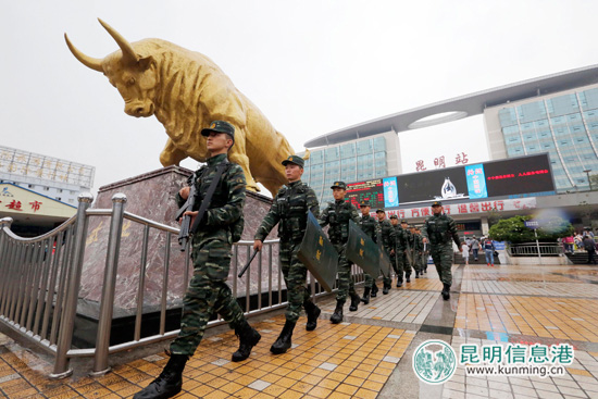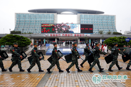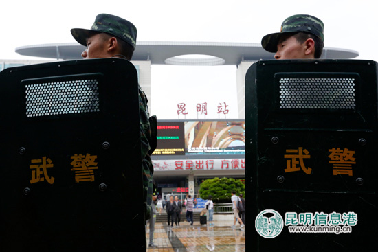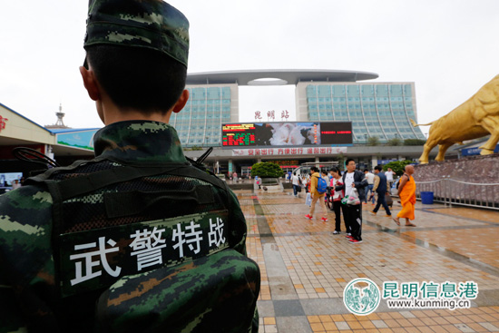 6月11日,武警特战队员在昆明火车站广场进行武装巡逻。