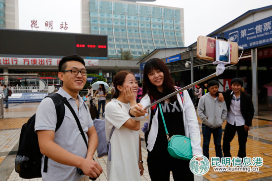 6月11日,三名乘客在昆明火车站广场拍照留念。