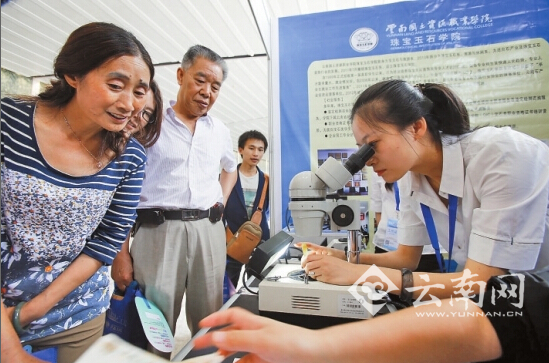 有人买到了心仪的商品,有人却因为买到假货而气恼。“我在5号馆买了一串非洲舒俱来石做的手串,听说展馆里可以检测就拿过来了。”昆明市民李师傅说,平时他很喜欢珠宝玉石,尤其近几年舒俱来石开始升值,他前前后后已经买了几个手串,这次就是想到南博会看看有没有好货,没想到花了2800元却买了假货。检测员告诉他,这个手串就是一般的玉石染了紫色的颜料,肉眼看上去跟真的一样。最后,李师傅找到参展商说明情况将货款退了回来。